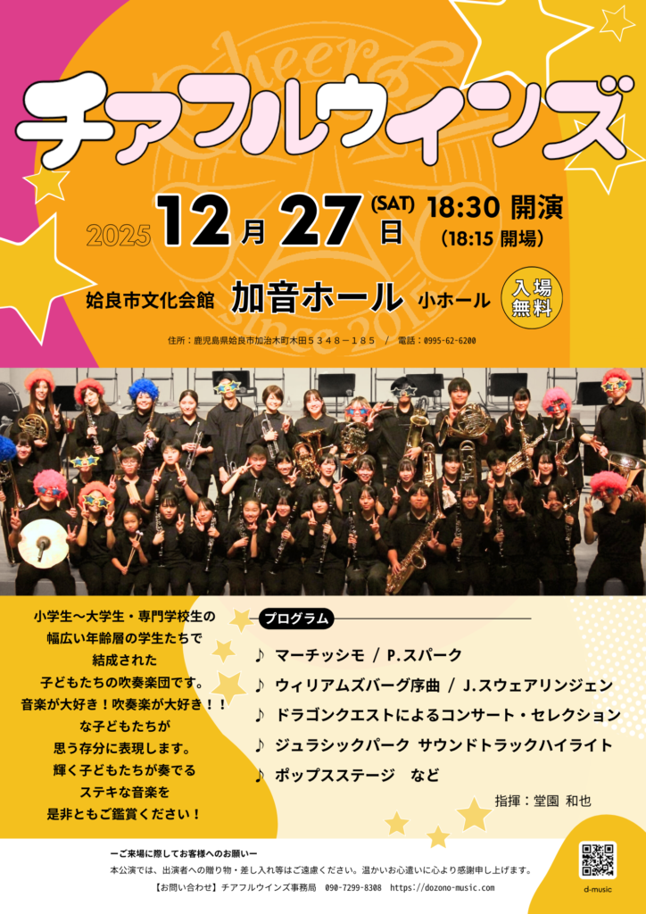 2025年12月17日 2025年12月17日 堂園クラリネット・トランペット教室 ブログ チアフルウインズ コンサート 12月27日(土) 18時15分開場 18時30分開演 加音ホール 小ホールにて! コメントを残す コメントをキャンセルメールアドレスが公開されることはありません。 ※ が付いている欄は必須項目ですコメント ※ 名前 ※ メール ※ サイト 次回のコメントで使用するためブラウザーに自分の名前、メールアドレス、サイトを保存する。 上に表示された文字を入力してください。